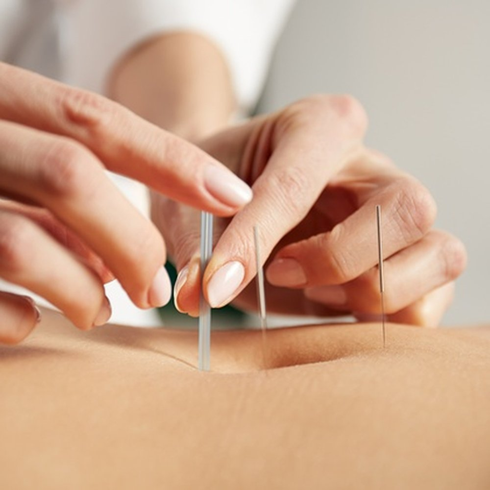 Inserting fine needles to stimulate energy flow and relieve pain or imbalances.